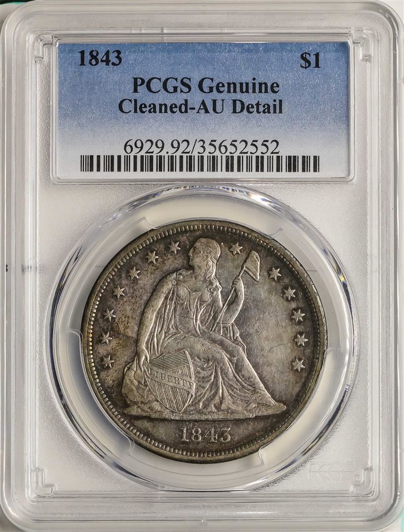 One 1843 $1 Liberty Seated Silver Dollar Coin PCGS AU Detail Nice Toning. PCGS Graded.