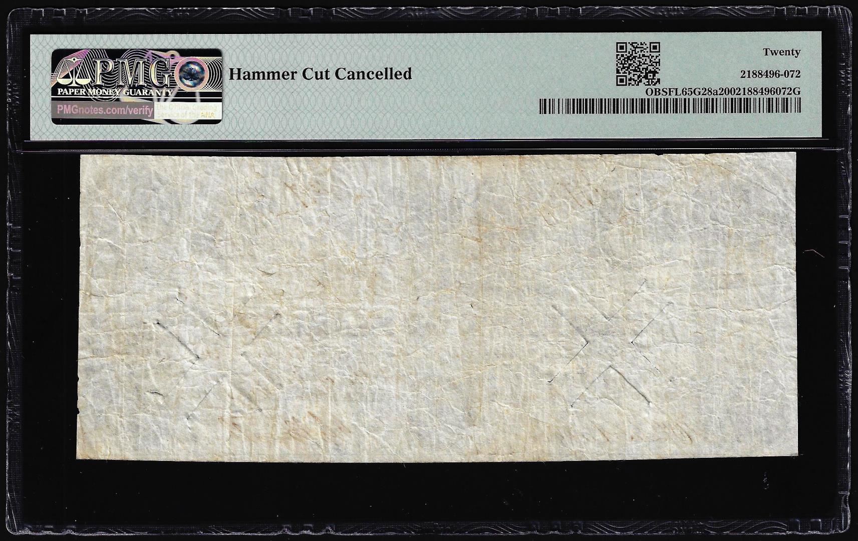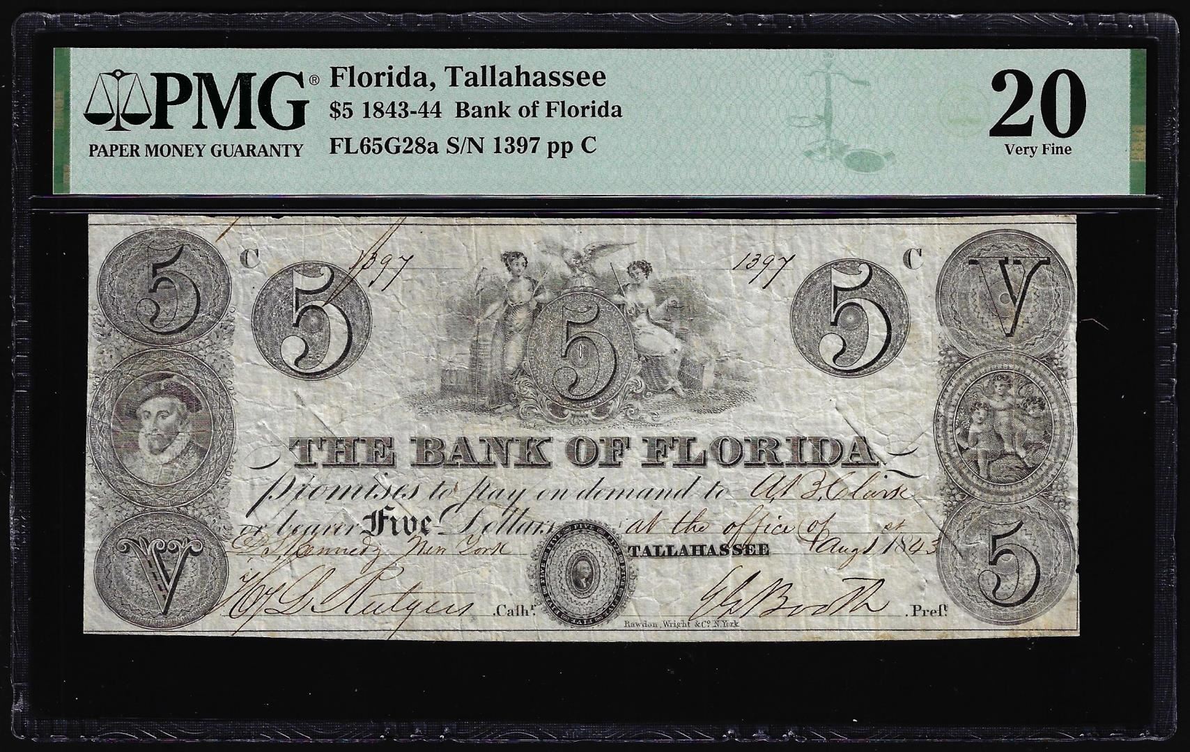 One 1843-44 $5 The Bank of Florida Tallahassee, FL Obsolete Note PMG Very Fine 20. PMG Certified.