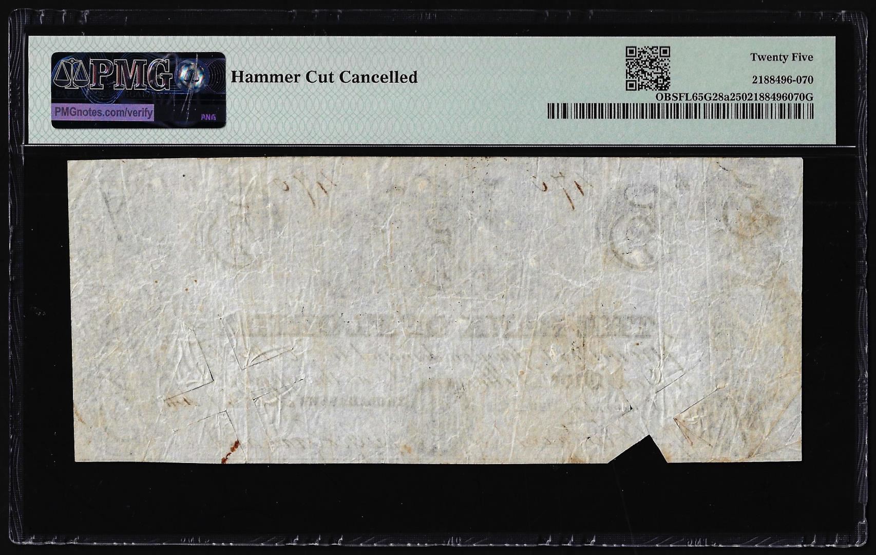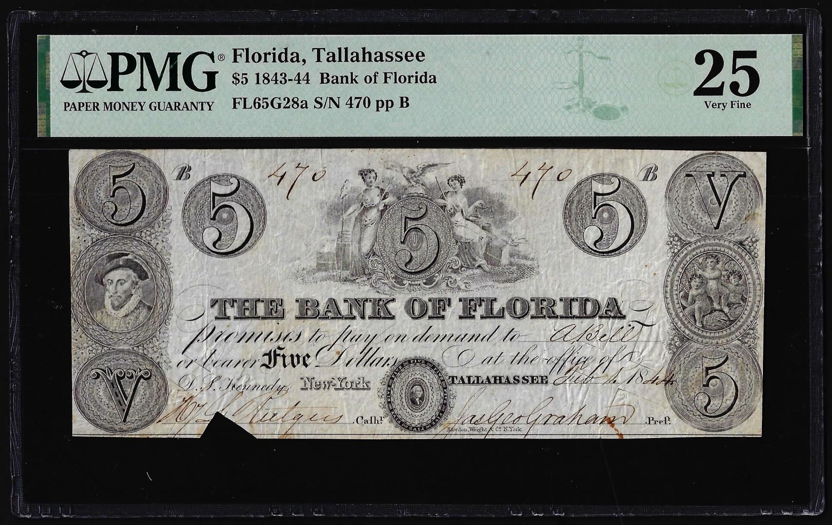 One 1843-44 $5 The Bank of Florida Tallahassee, FL Obsolete Note PMG Very Fine 25. PMG Certified.