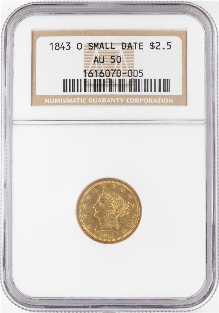 One 1843-O Small Date $2.5 Liberty Head Quarter Eagle Gold Coin NGC AU50. NGC Certified.