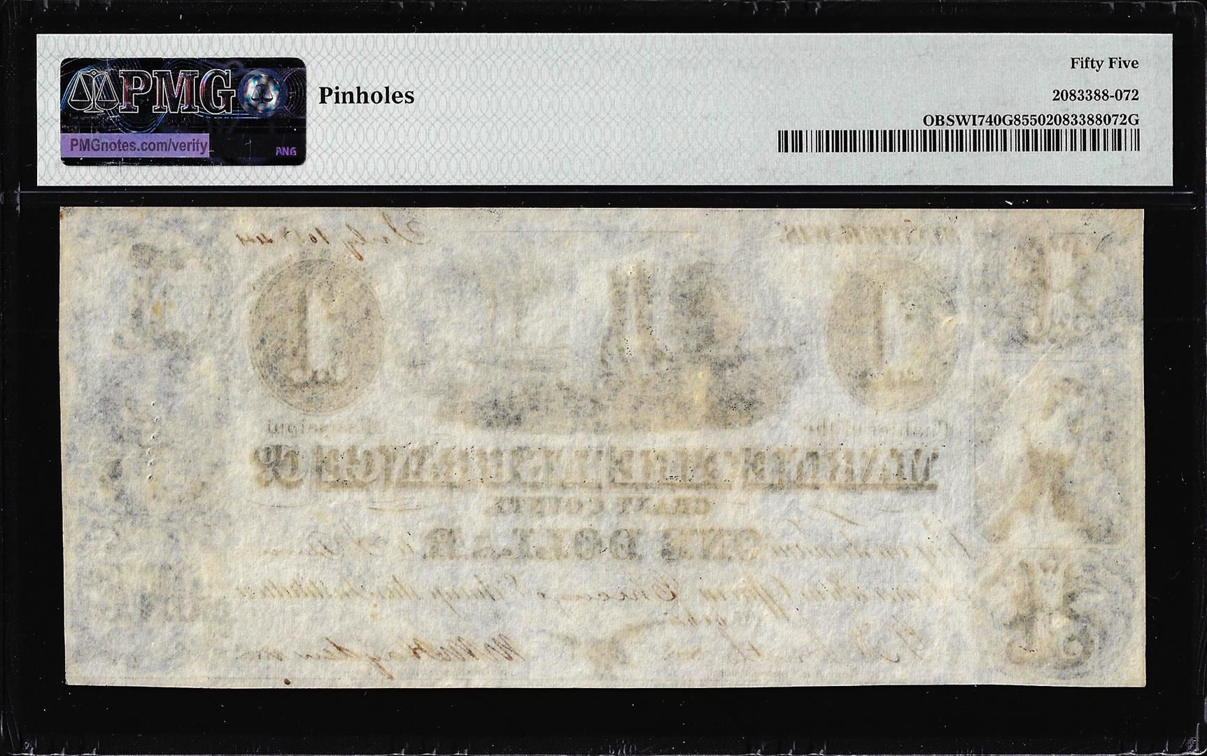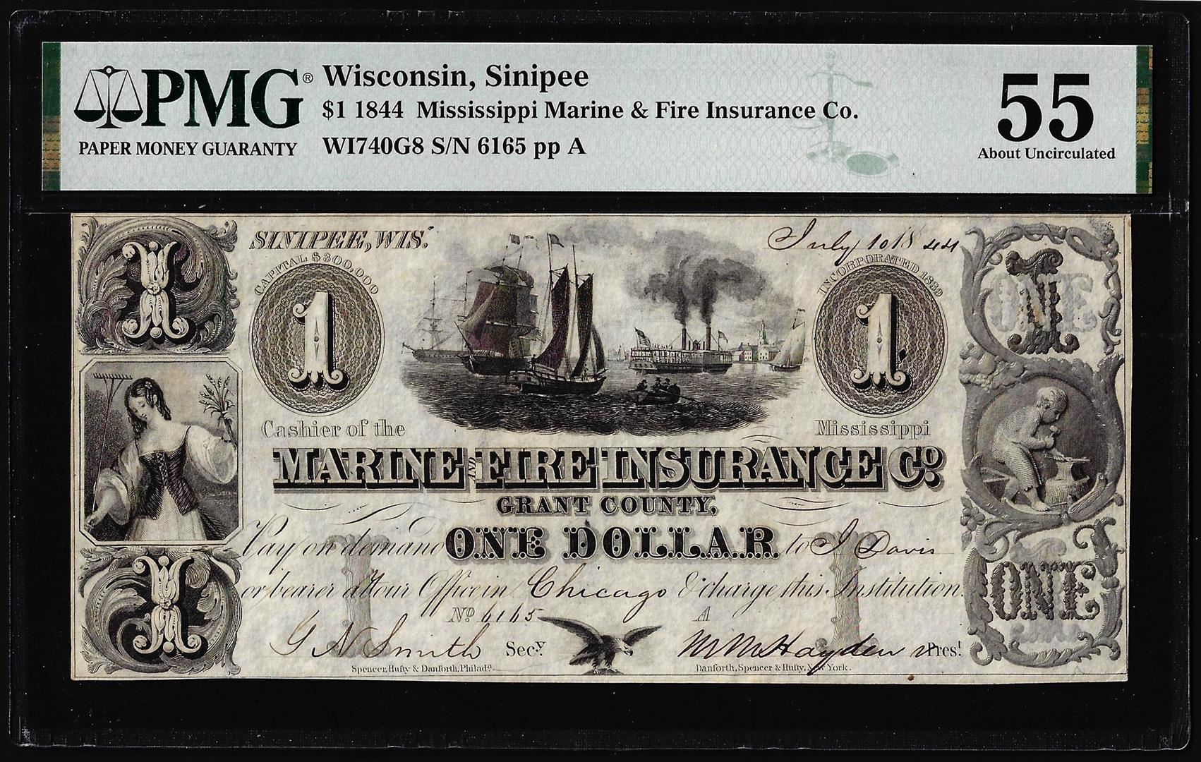 One 1844 $1 Marine & Fire Insurance Sinipee, WI Obsolete Note PMG About Uncirculated 55. PMG Certified.