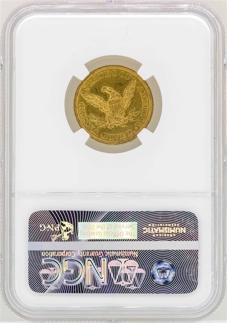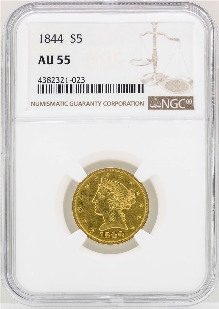 One 1844 $5 Liberty Head Half Eagle Gold Coin NGC AU55. NGC Certified.