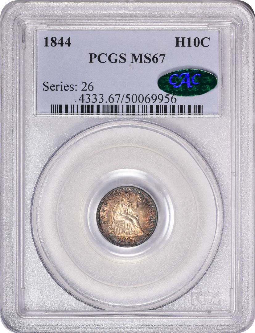 One 1844 Seated Liberty Half Dime Coin Arrows PCGS MS67 CAC Amazing Toning. PCGS Graded.