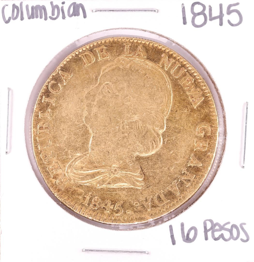 One 1845 Colombia 16 Pesos Gold Coin.