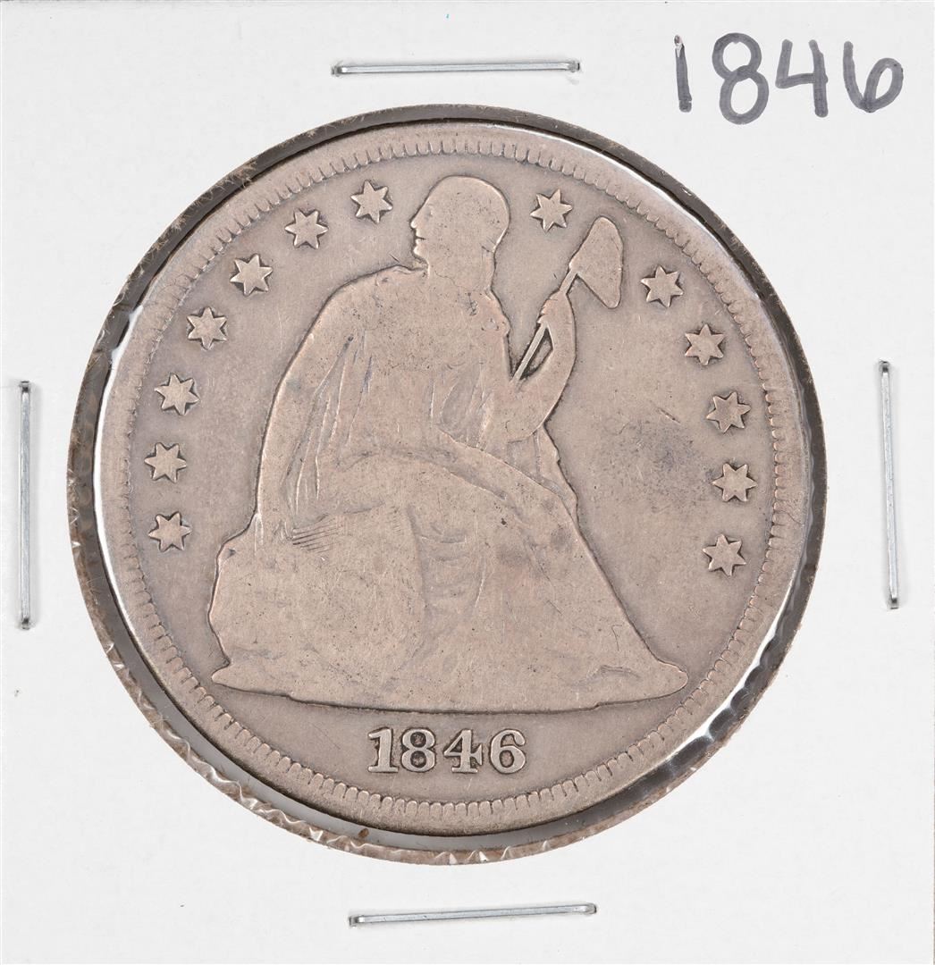 One 1846 $1 Seated Liberty Silver Dollar Coin.