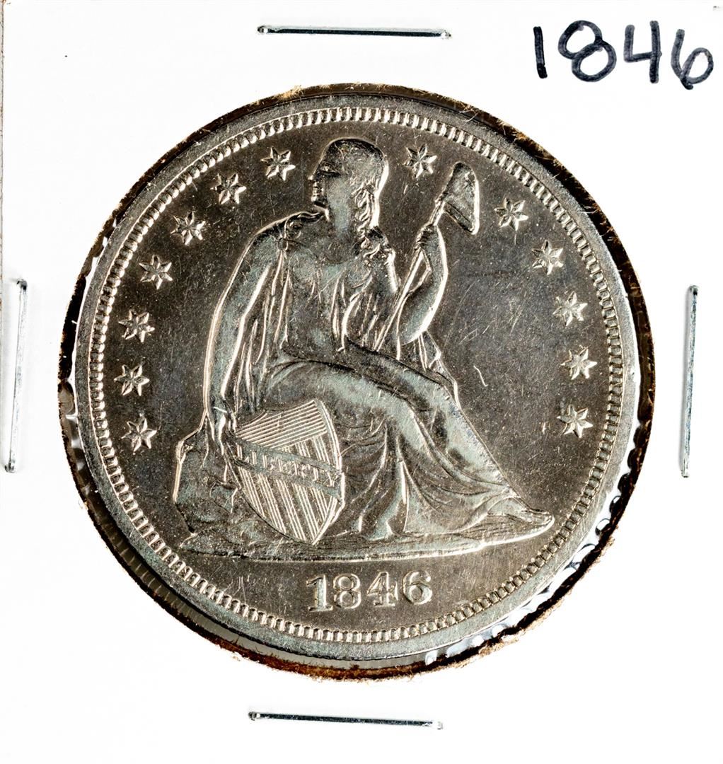 One 1846 $1 Seated Liberty Silver Dollar Coin.