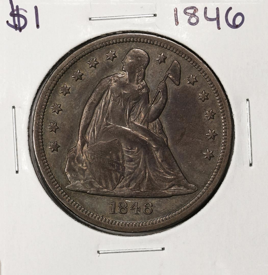 One 1846 $1 Seated Liberty Silver Dollar Coin.