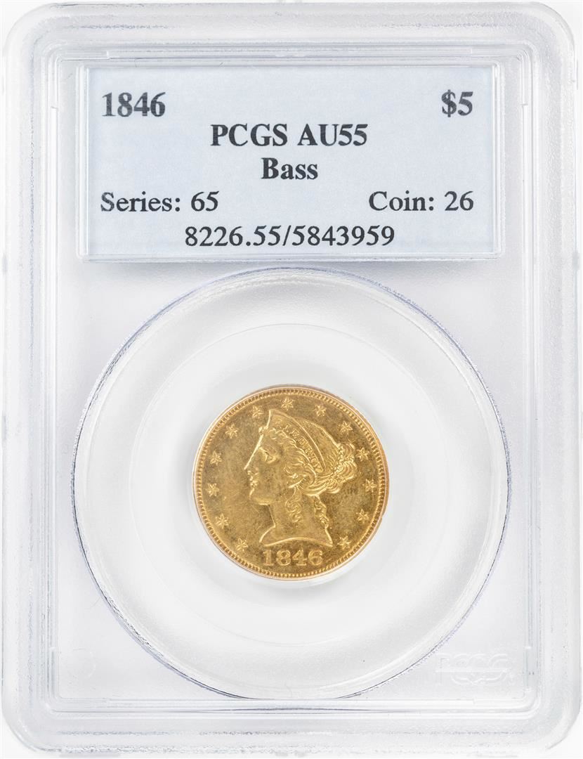 One 1846 $5 Liberty Head Half Eagle Gold Coin PCGS AU55 Bass Collection. PCGS Graded.
