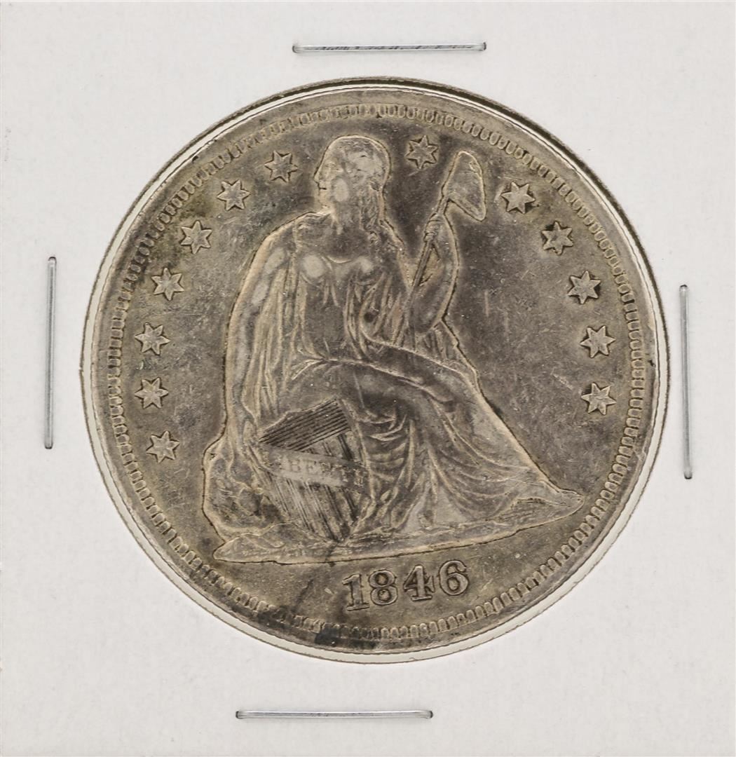 One 1846 No Motto $1 Seated Liberty Silver Dollar Coin.