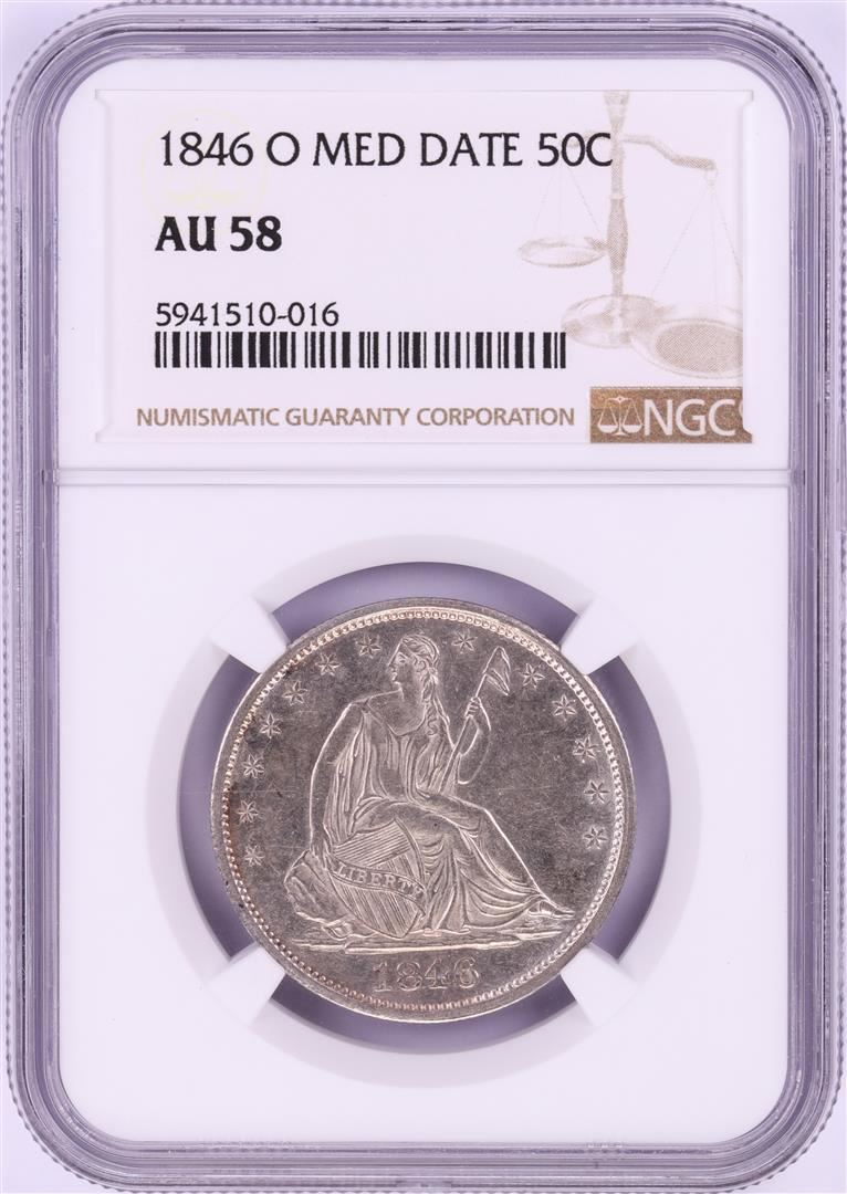 One 1846-O Medium Date Seated Liberty Half Dollar Coin NGC AU58. NGC Certified.