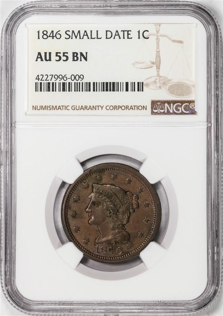 One 1846 Small Date Coronet Head Large Cent Coin NGC AU55BN. NGC Certified.