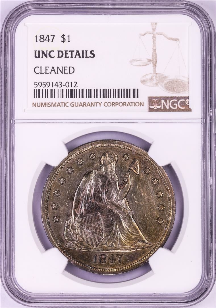 One 1847 $1 Seated Liberty Silver Dollar Coin NGC Unc Details. NGC Certified.