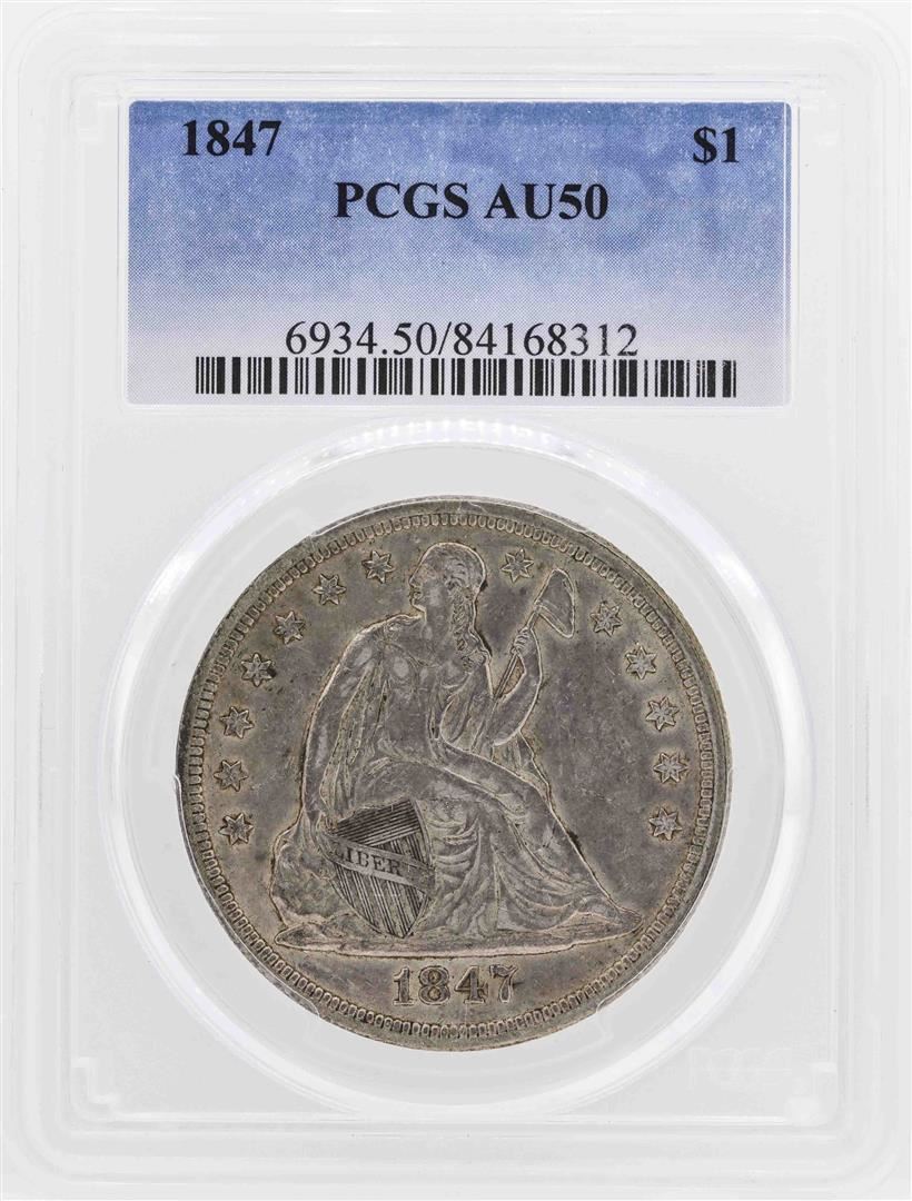 One 1847 $1 Seated Liberty Silver Dollar Coin PCGS AU50. PCGS Graded.
