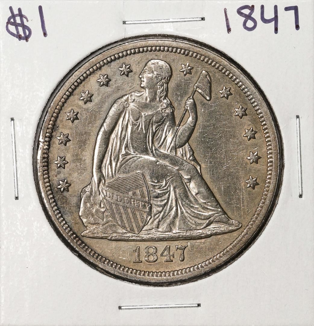 One 1847 $1 Seated Liberty Silver Dollar Coin.