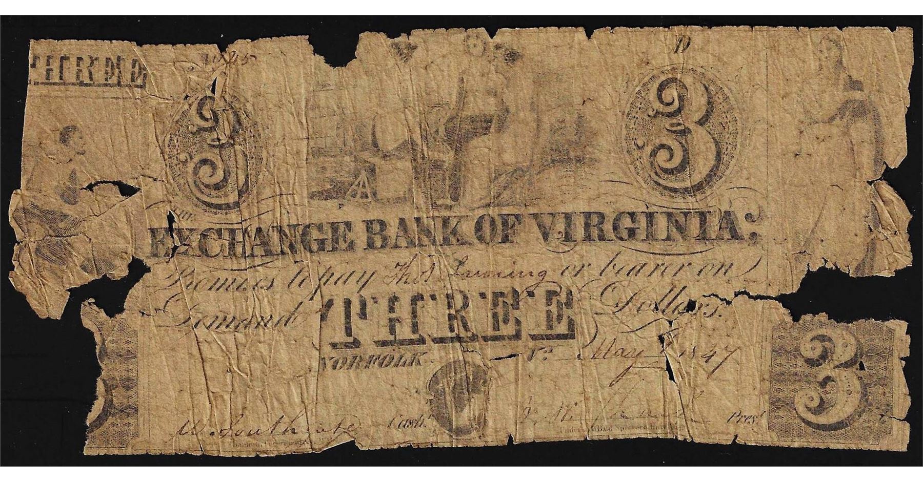 One 1847 $3 The Exchange Bank of Virginia Obsolete Note.