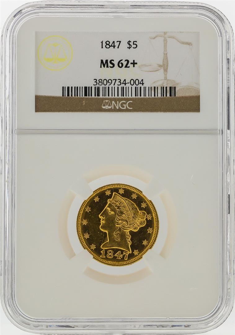 One 1847 $5 Liberty Head Half Eagle Gold Coin NGC MS62+. NGC Certified.