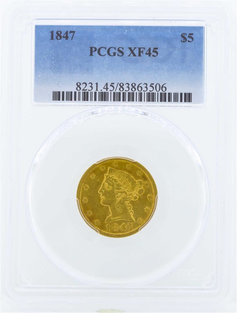 One 1847 $5 Liberty Head Half Eagle Gold Coin PCGS XF45. PCGS Graded.