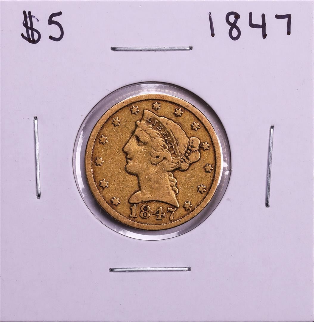 One 1847 $5 Liberty Head Half Eagle Gold Coin.