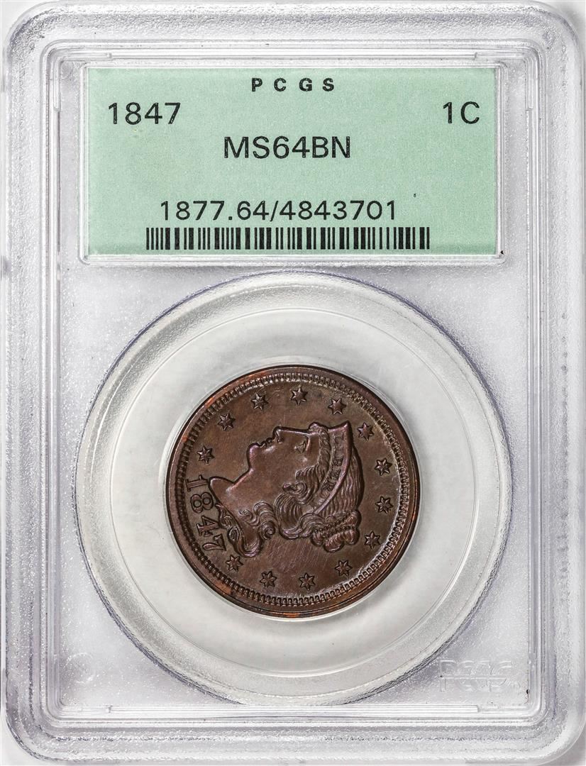 One 1847 Coronet Head Large Cent Coin PCGS MS64BN Old Green Holder. PCGS Graded.