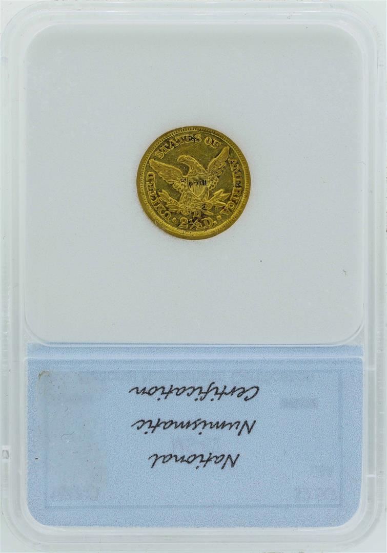 One 1847-D $2.5 Liberty Head Quarter Eagle Gold Coin. This coin has been graded by "National Numismatic Certification" company. However, since it is not one of the main numismatic certification companies that we currently recognize, we purposely blurred out the assigned grade of the coin to avoid any confusion. We encourage each bidder to make their own determination as to the grade & value of the coin.