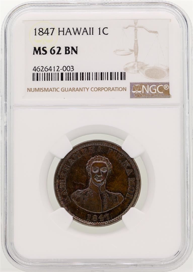 One 1847 Hawaii Large Cent Coin NGC MS62BN. NGC Certified.