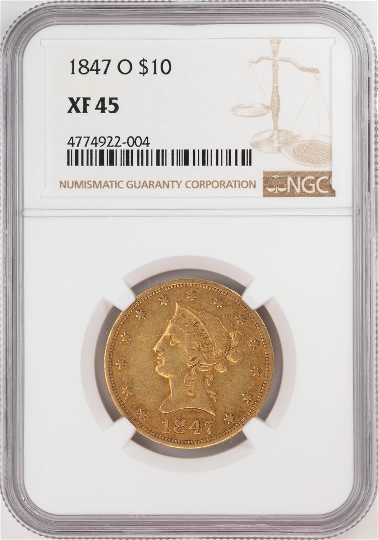 One 1847-O $10 Liberty Head Eagle Gold Coin NGC XF45. NGC Certified.