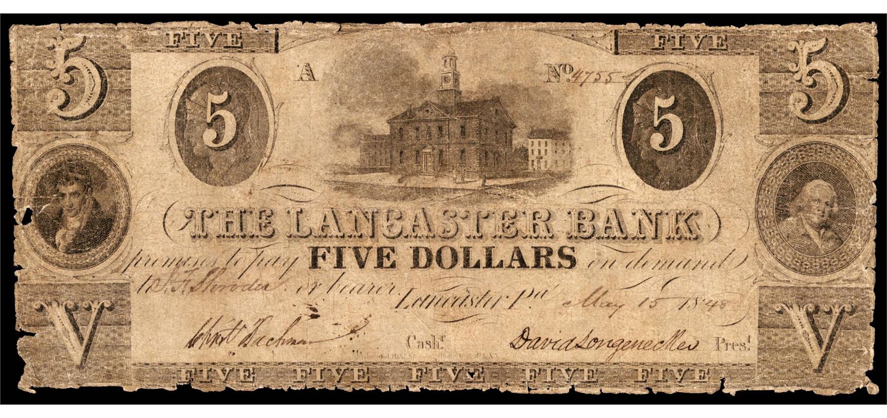 1848 $5 The Lancaster Bank Lancaster, PA Obsolete Note