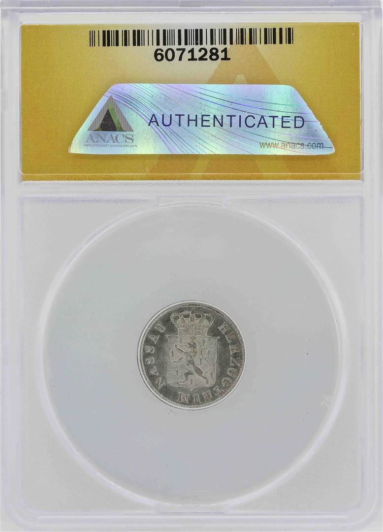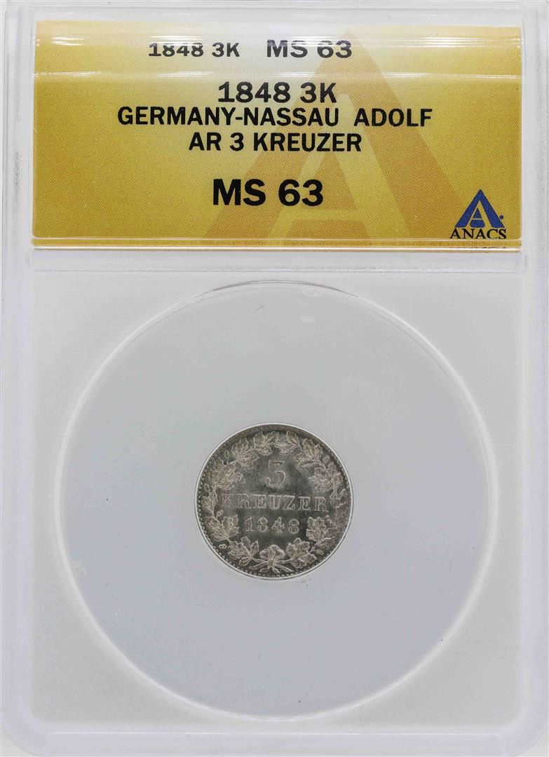 One 1848 Germany-Nassau 3 Kreuzer Coin ANACS MS63. ANACS Certified.