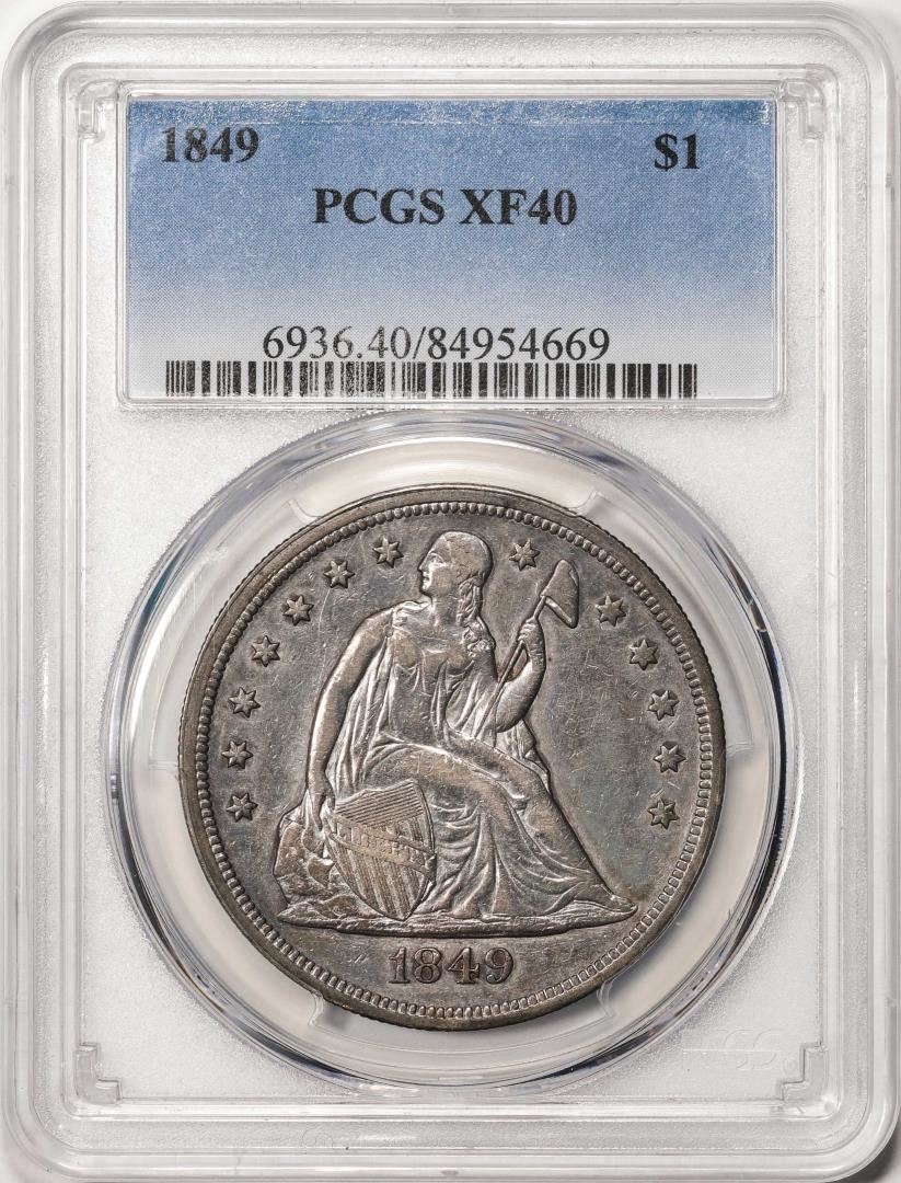One 1849 $1 Seated Liberty Silver Dollar Coin PCGS XF40. PCGS Graded.