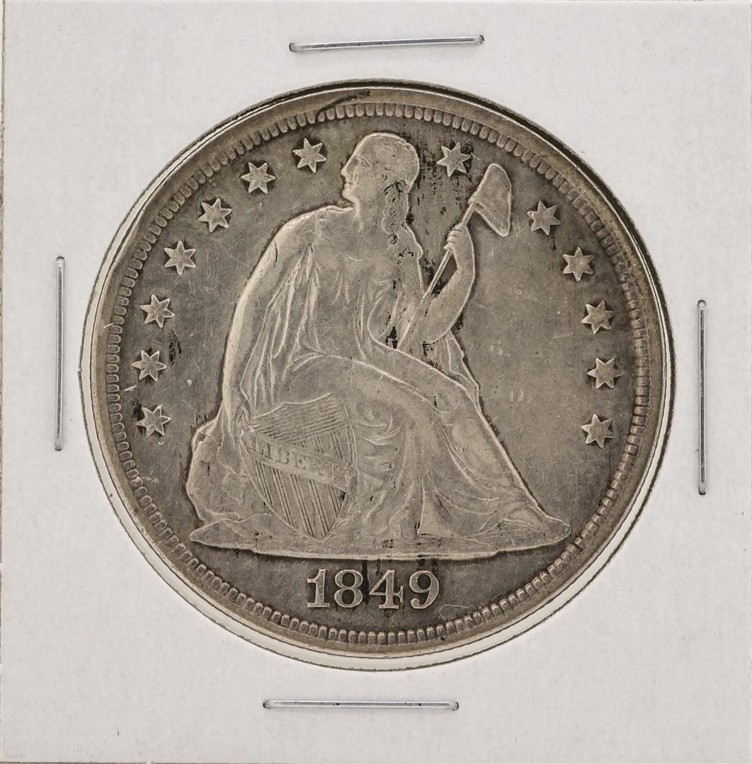 One 1849 $1 Seated Liberty Silver Dollar Coin.