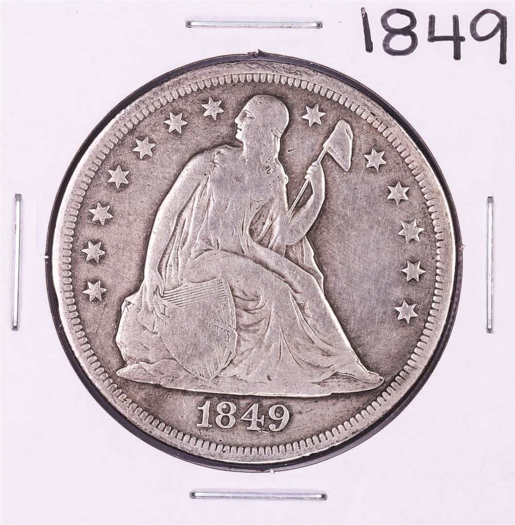 One 1849 $1 Seated Liberty Silver Dollar Coin.