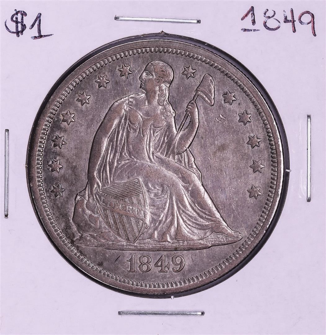 One 1849 $1 Seated Liberty Silver Dollar Coin.