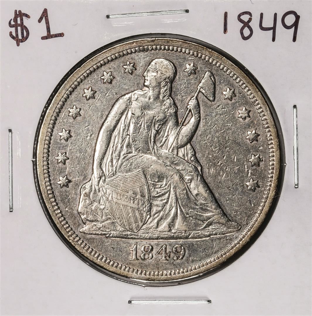 One 1849 $1 Seated Liberty Silver Dollar Coin.