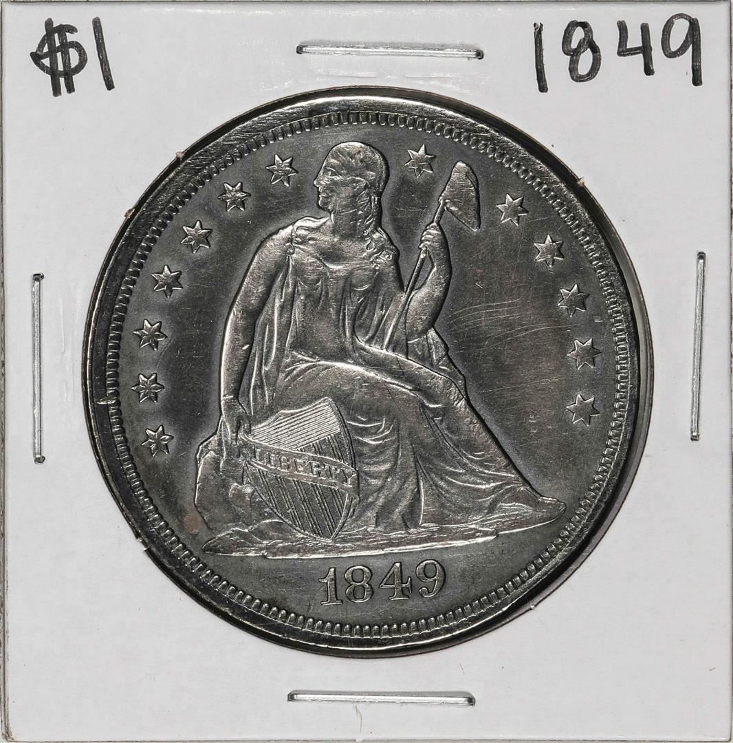 One 1849 $1 Seated Liberty Silver Dollar Coin.