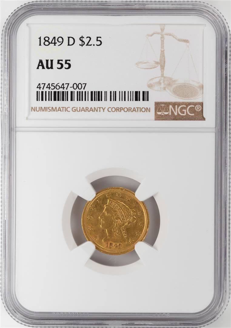 One 1849-D $2 1/2 Liberty Head Quarter Eagle Gold Coin NGC AU55. NGC Certified.