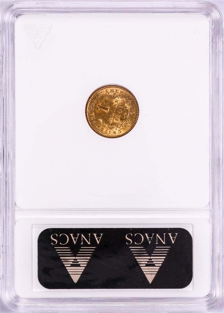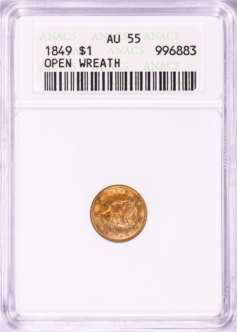 One 1849 Open Wreath $1 Liberty Head Gold Dollar Coin ANACS AU55. ANACS Certified.