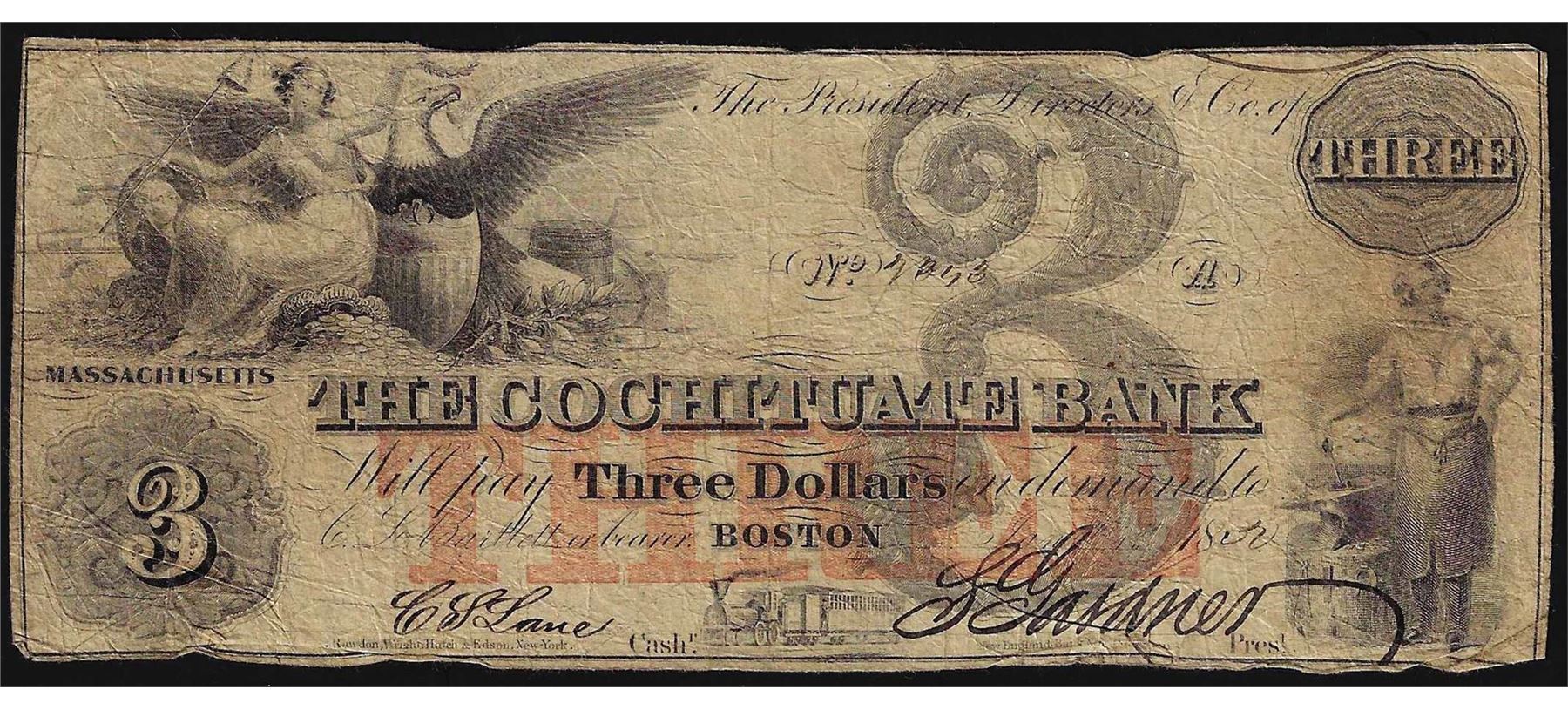 One 1850 $3 The Cochituate Bank Obsolete Note.