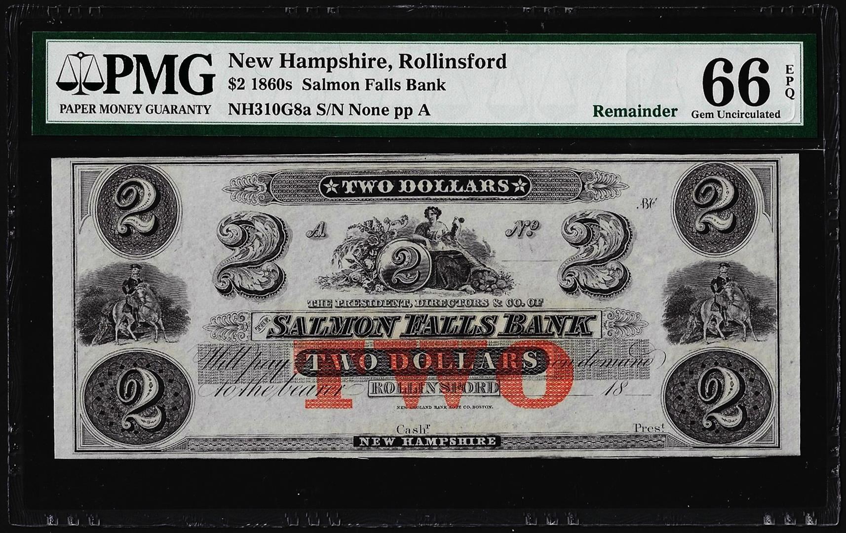One 1850-60's $2 Salmon Falls Bank Obsolete Note PMG Gem Uncirculated 66EPQ. PMG Certified.