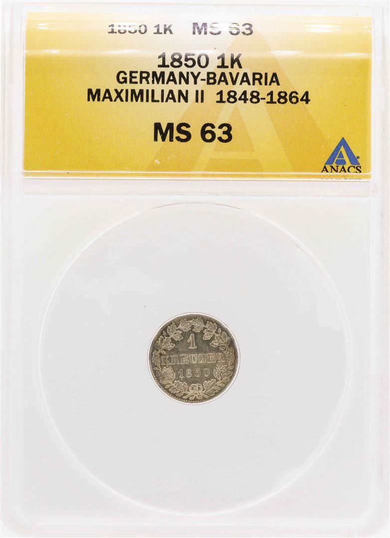One 1850 Germany-Bavaria Maximilian II 1 Kreuzer Coin ANACS MS63. ANACS Certified.