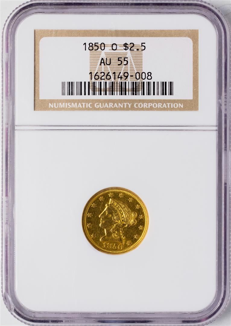 One 1850-O $2 1/2 Liberty Head Quarter Eagle Gold Coin NGC AU55. NGC Certified.