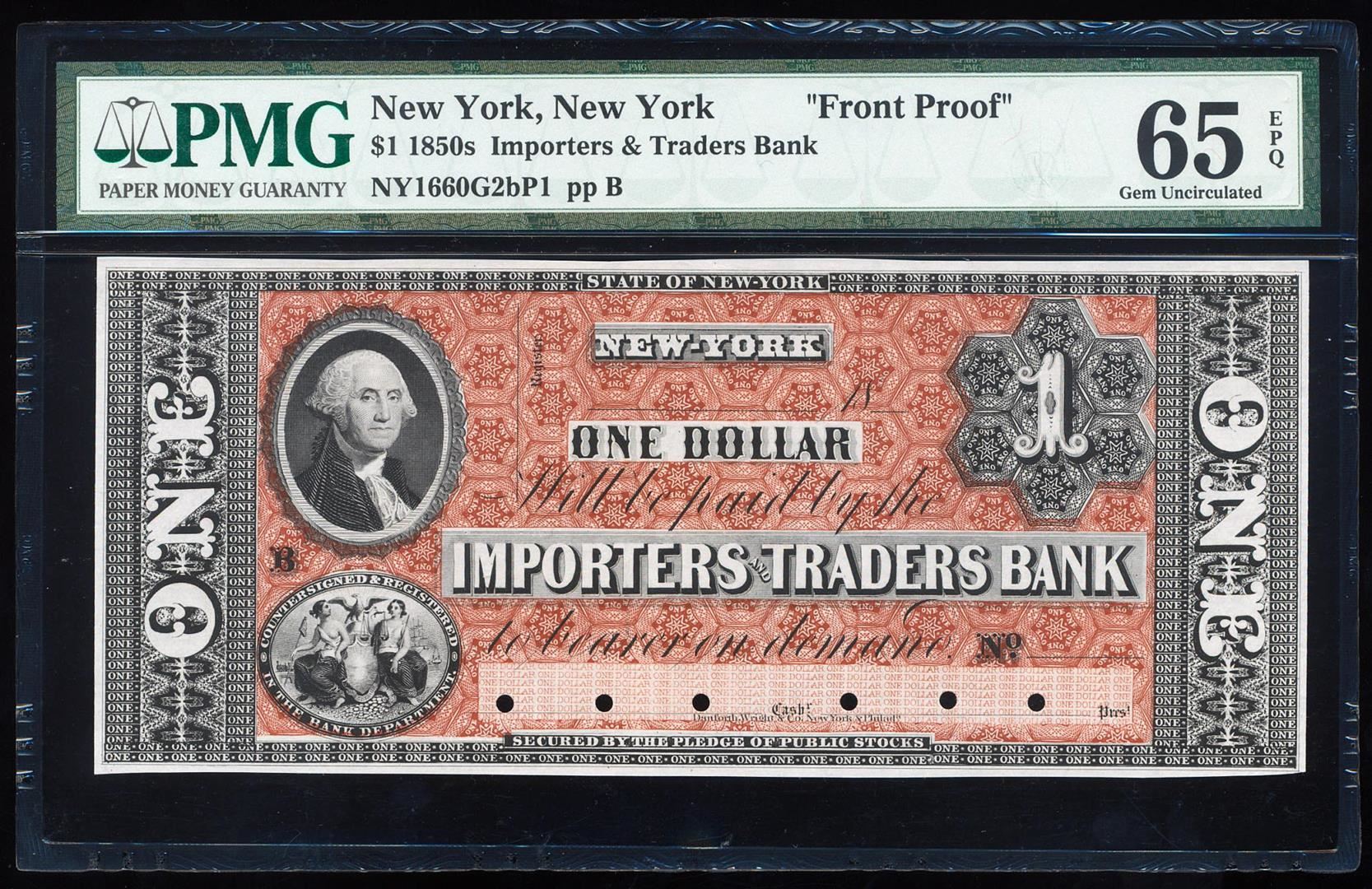 One 1850's $1 Importers & Traders Bank Front Proof Note PMG Gem Uncirculated 65EPQ. PMG Certified.