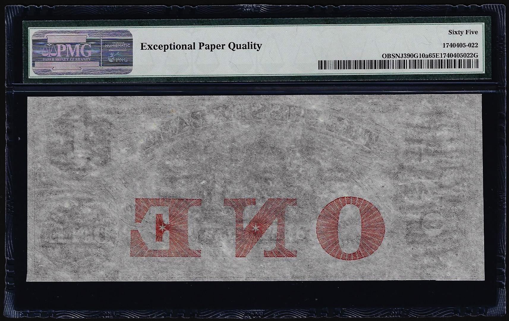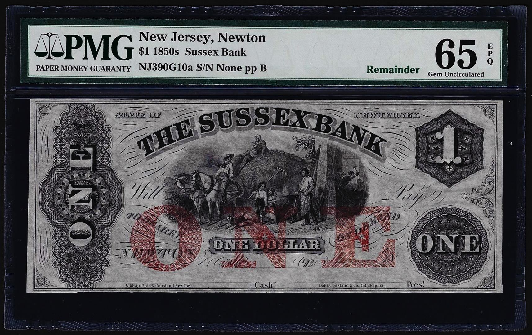 One 1850's $1 The Sussex Bank New Jersey Obsolete Note PMG Gem Uncirculated 65EPQ. PMG Certified.