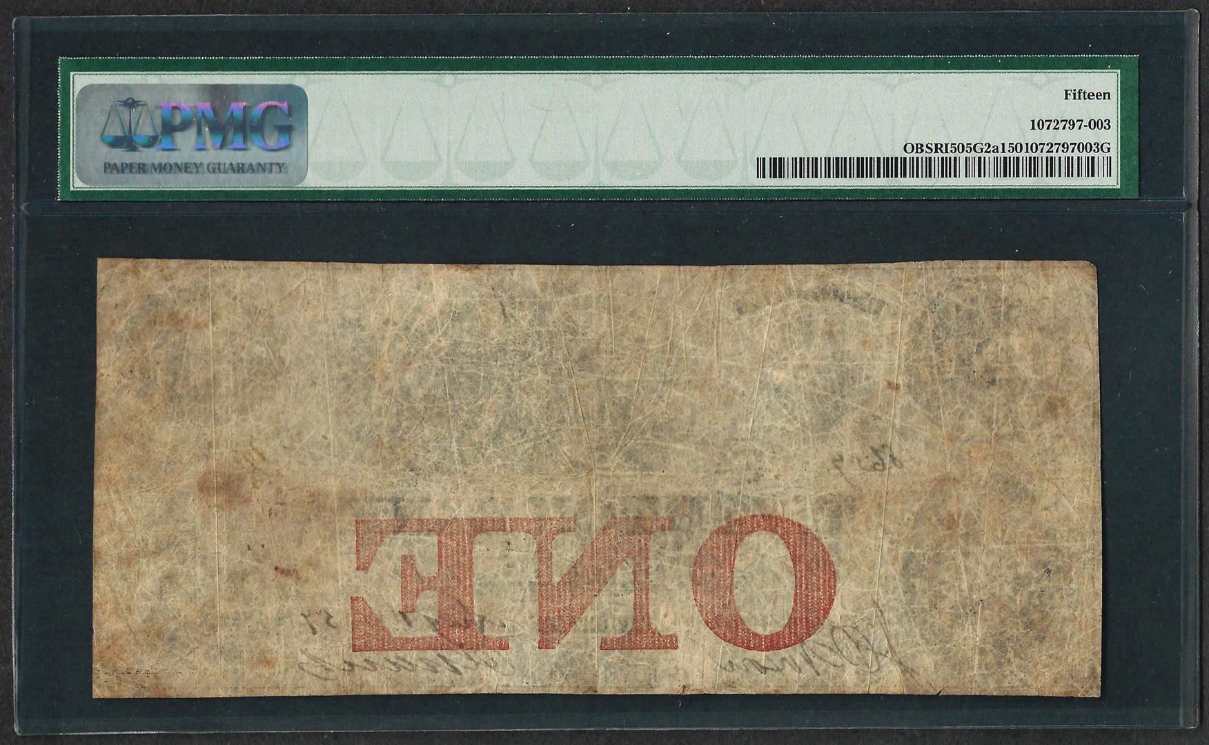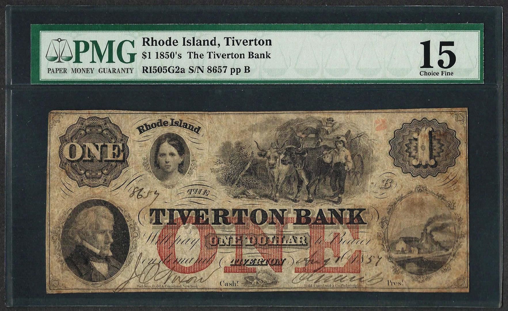 One 1850's $1 The Tiverton Bank Obsolete Note PMG Choice Fine 15. PMG Certified.