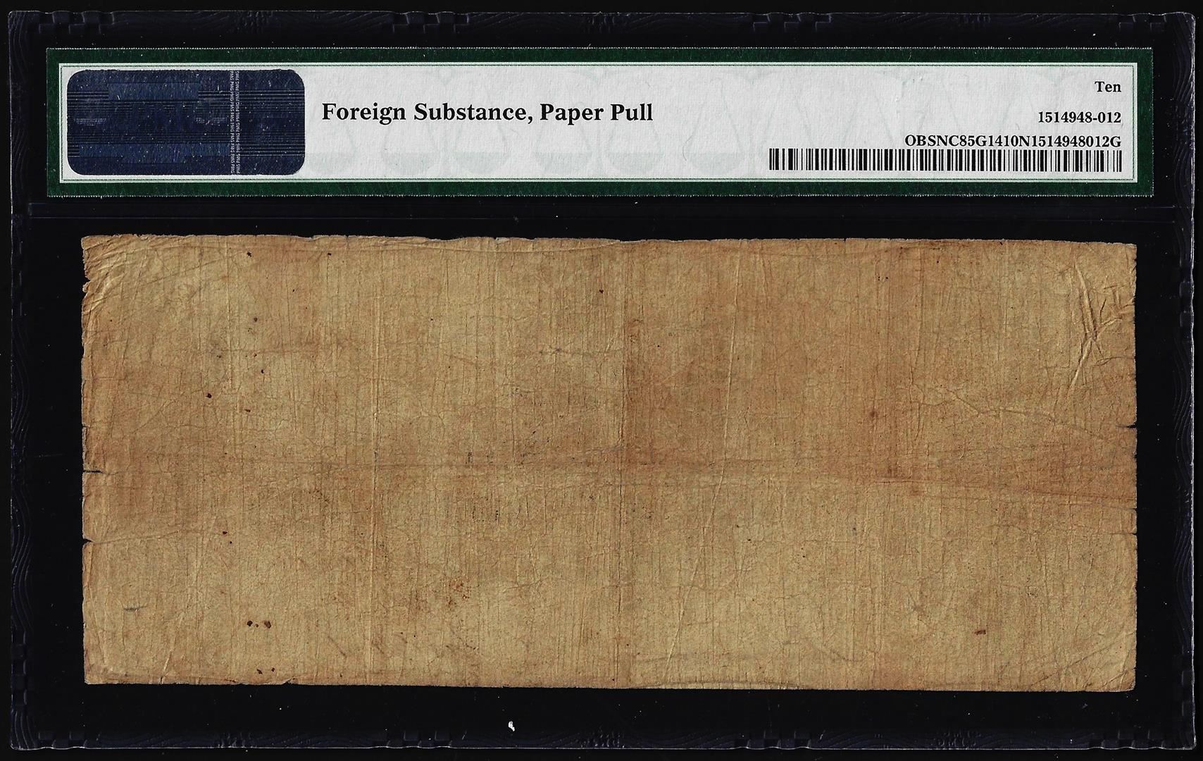 One 1850's $10 Bank of Washington North Carolina Obsolete Note PMG Very Good 10 Net. PMG Certified.