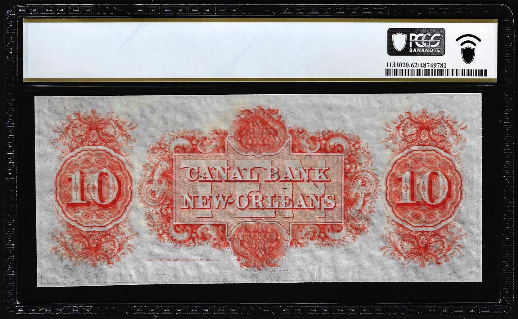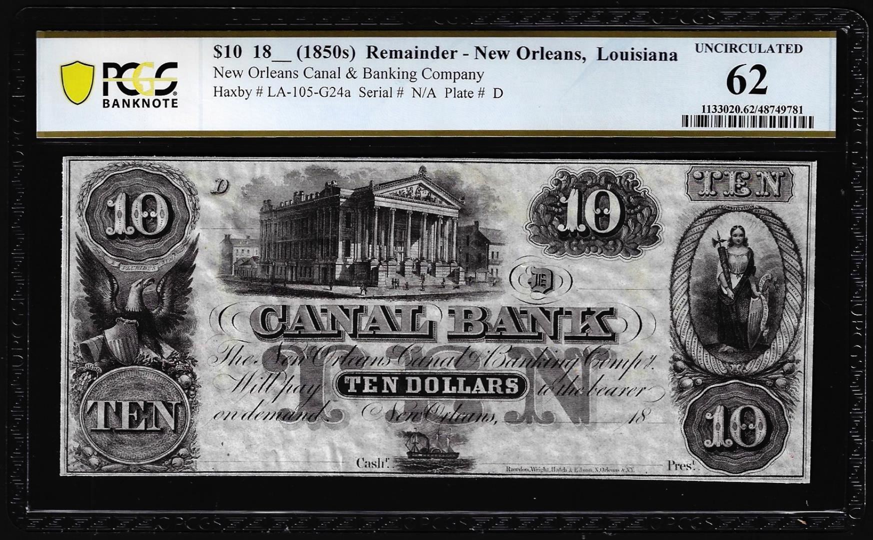 One 1850's $10 Canal Bank of New Orleans, LA Remainder Obsolete Note PCGS Uncirculated 62. PCGS Graded.
