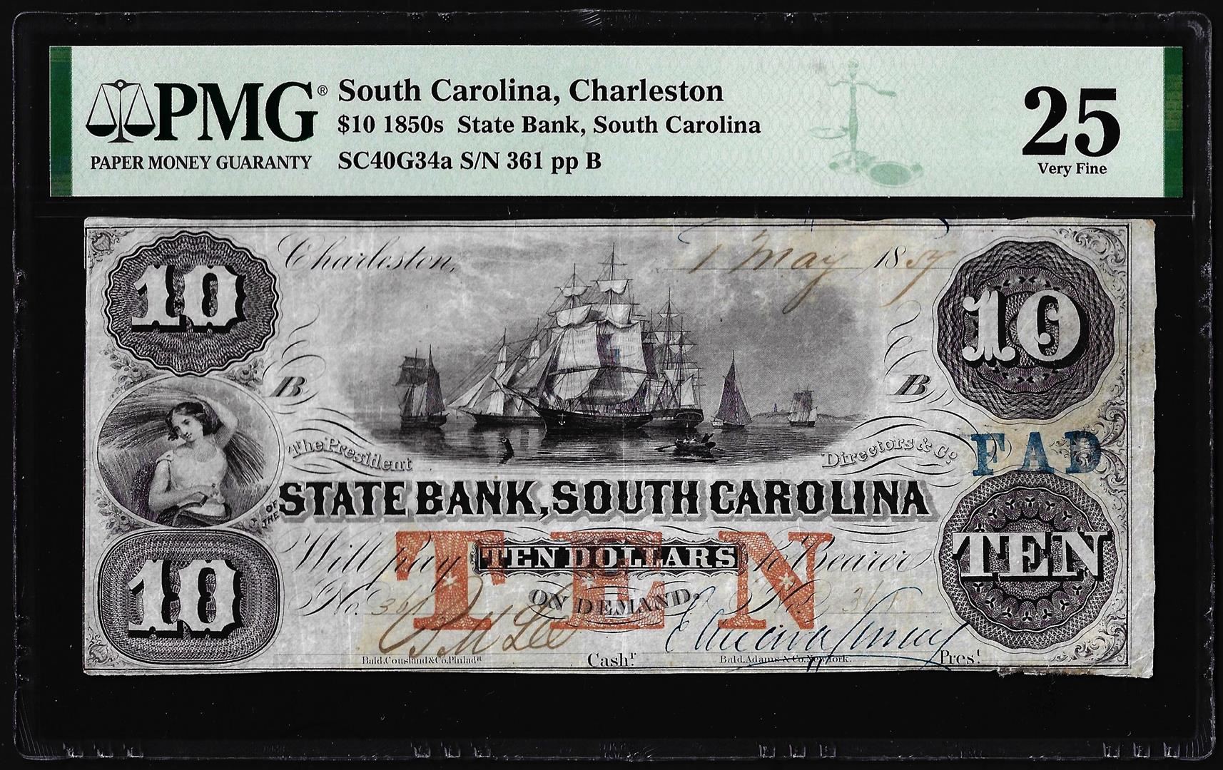 1850's $10 State Bank South Carolina Charleston Obsolete Note PMG Very Fine 25