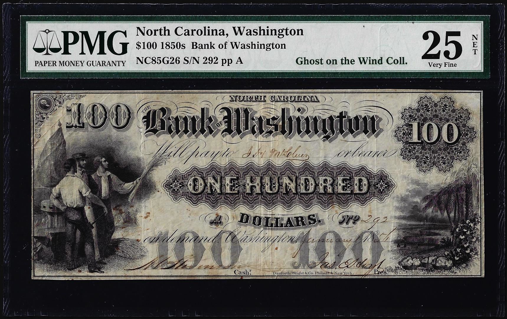1850's $100 Bank of Washington North Carolina Obsolete Note PMG Very Fine 25 Net