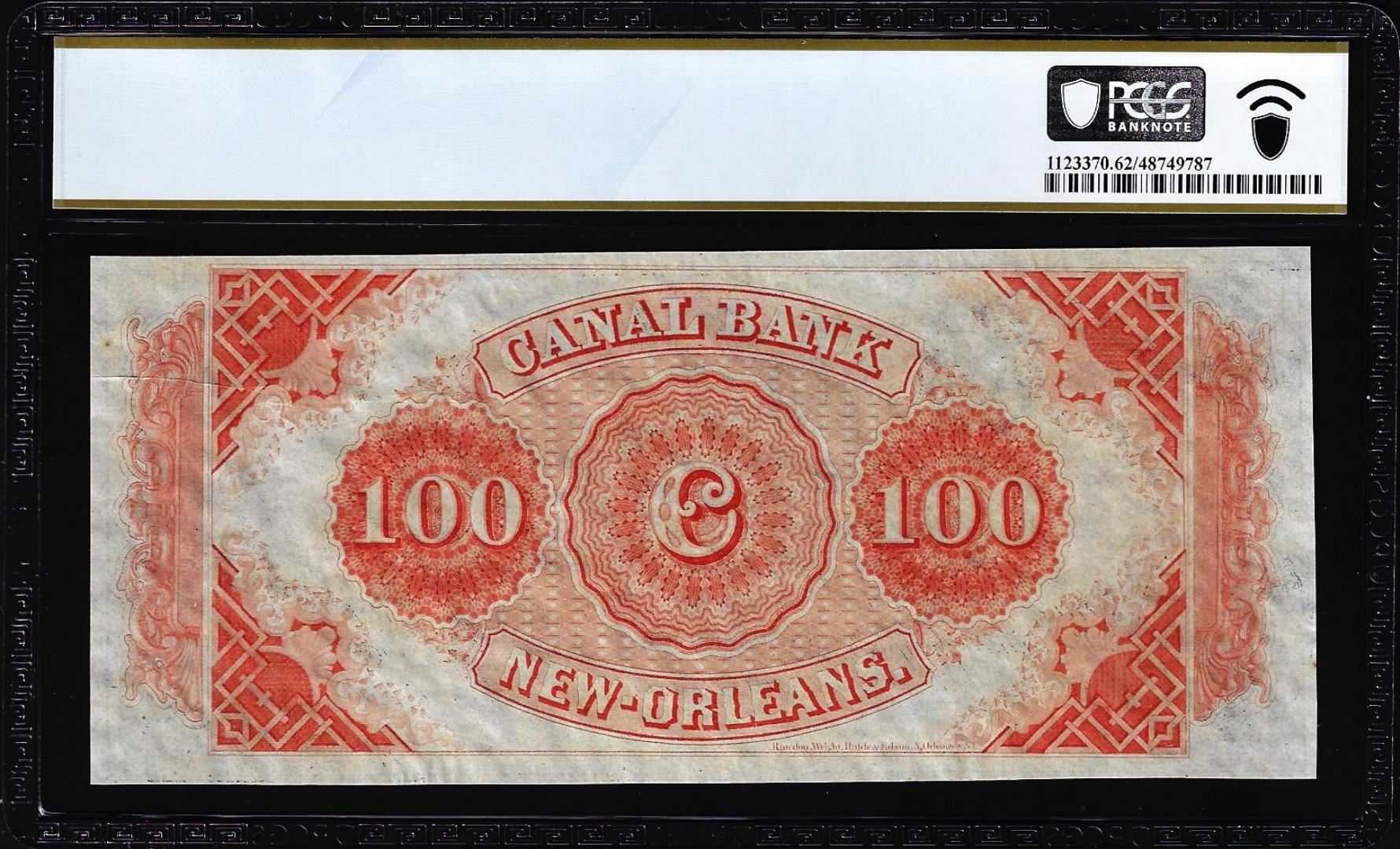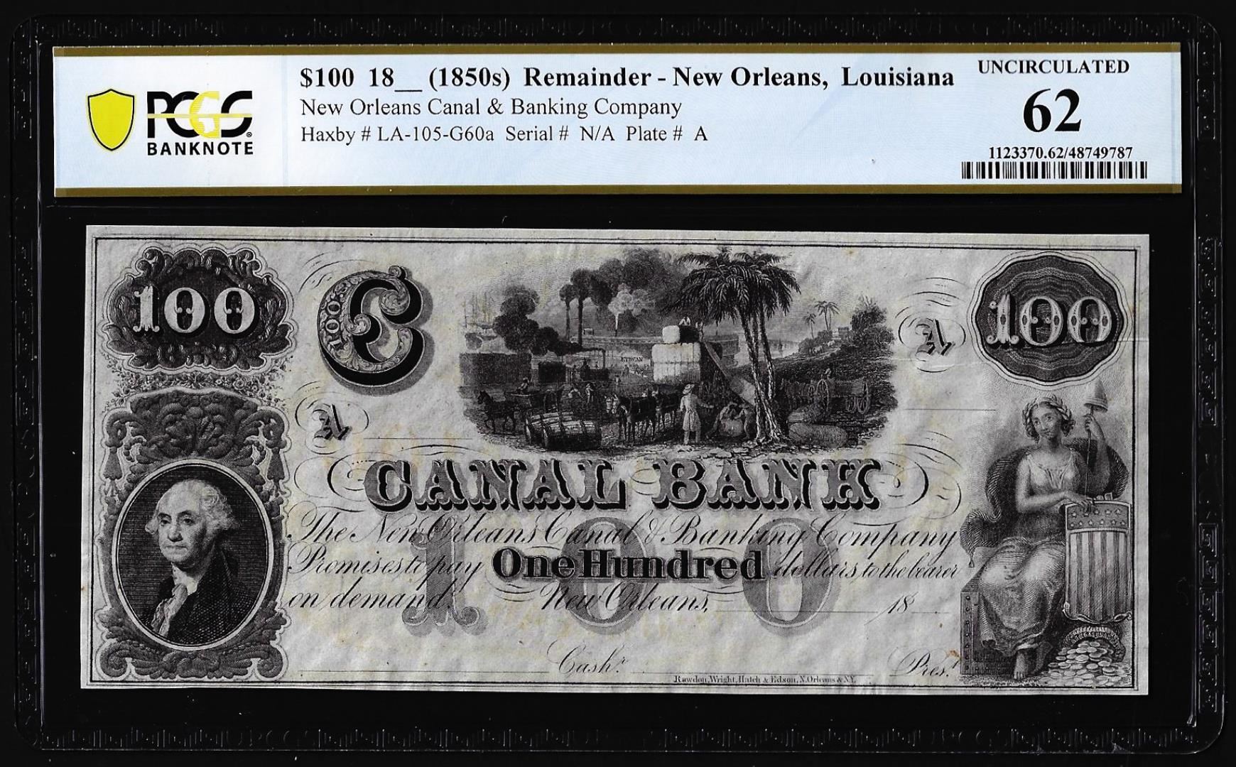 One 1850's $100 Canal Bank New Orleans, LA Remainder Obsolete Note PCGS Uncirculated 62. PCGS Graded.
