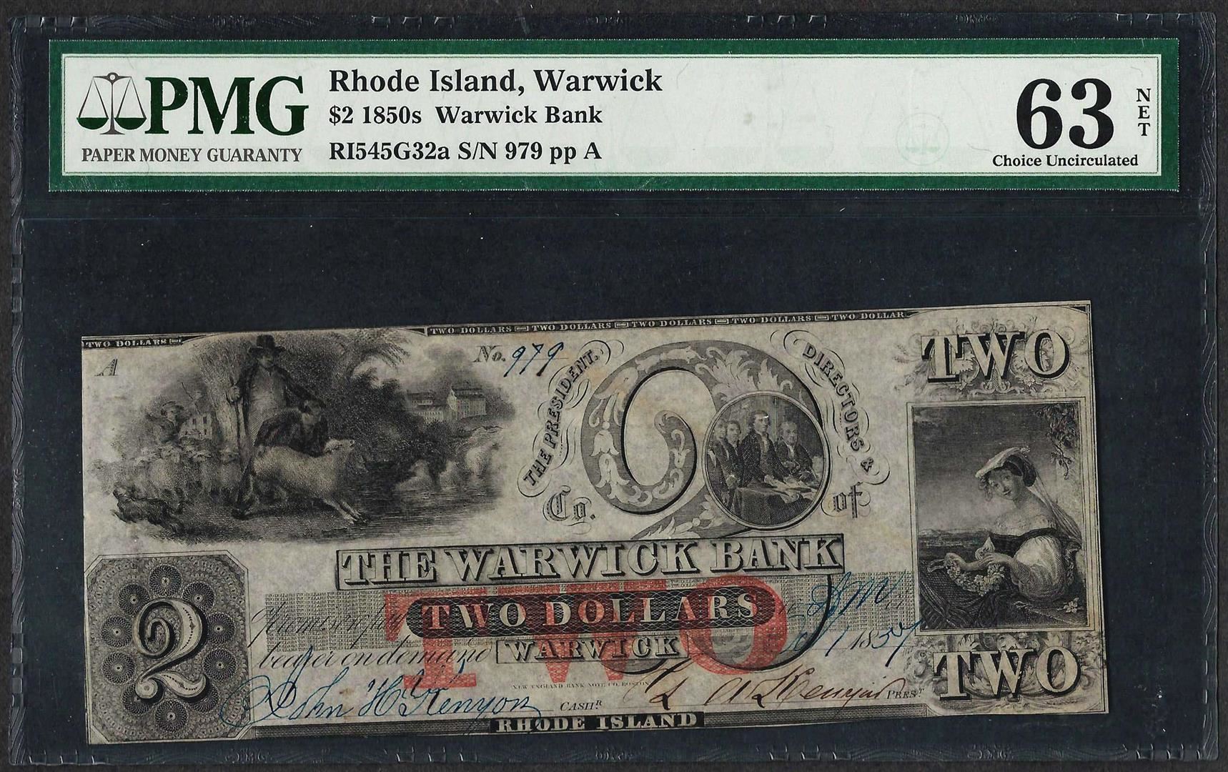 1850's $2 Warwick Bank Rhode Island Obsolete Note PMG Choice Uncirculated 63 Net