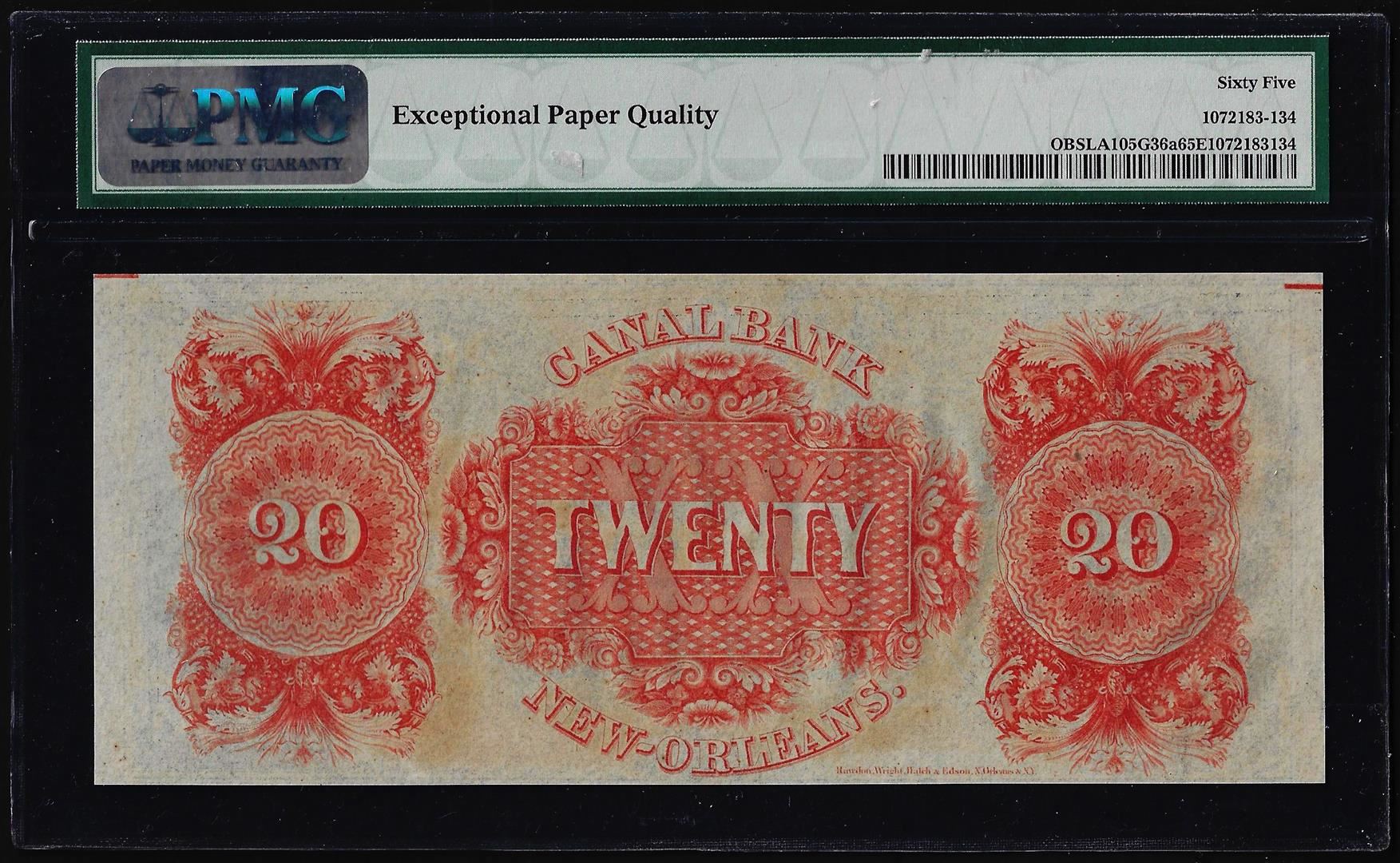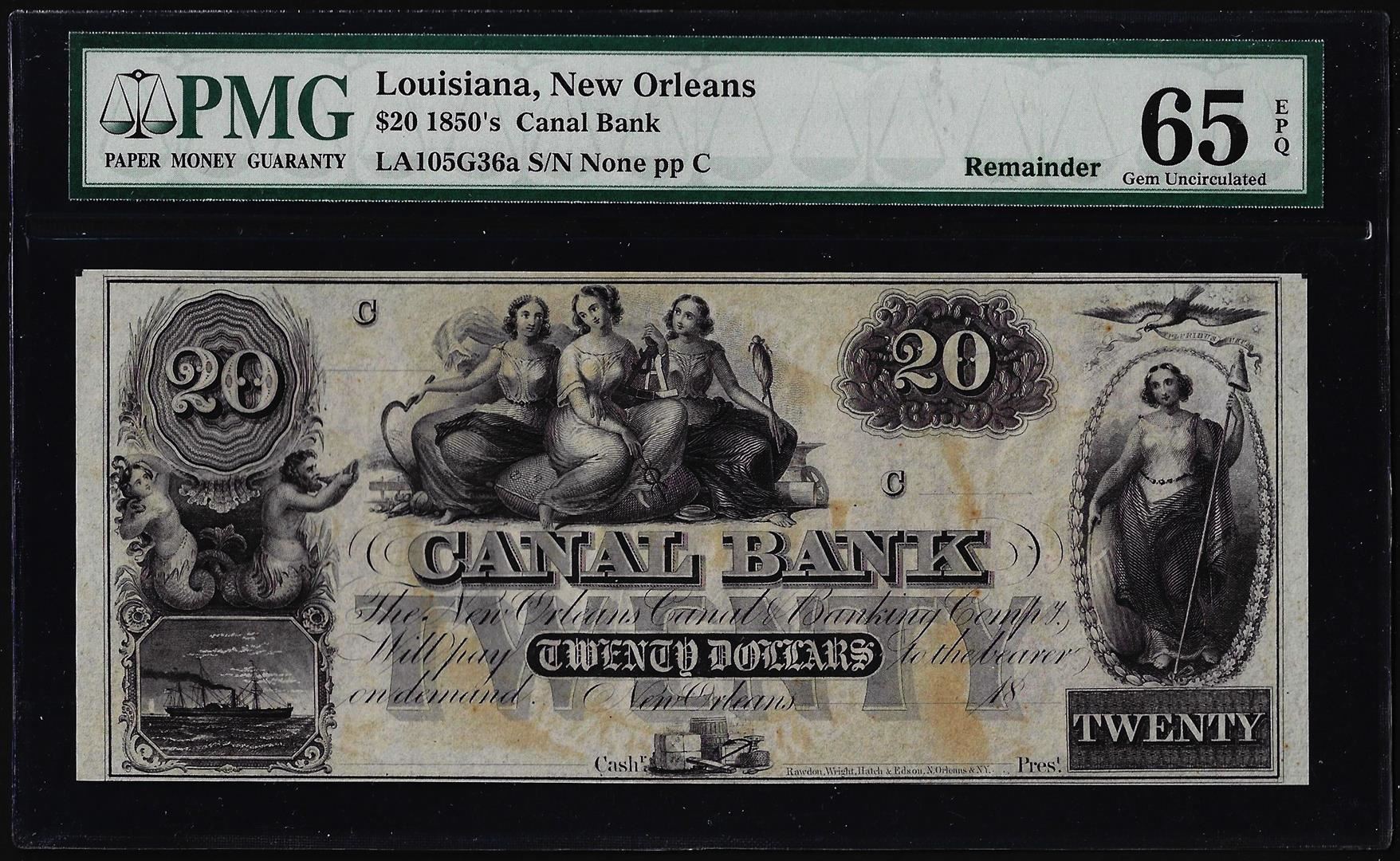 One 1850's $20 Canal Bank New Orleans Louisiana Obsolete Note PMG Gem Uncirculated 65EPQ. PMG Certified.
